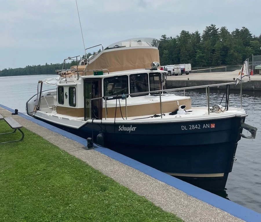 In other news, we got out of the Port of Orillia marina this morning on time (way too early according to at least one of us) in order to time a train bridge opening at 9 AM. When we arrived at the bridge right on time, we were boat 5 in line waiting for it to open. Eventually, the first boats turned around and left after seeing a sign that there was expected to be a high volume of train traffic and the bridge would not be opening until “eleven-ish”. The bridge has a 14 foot clearance and Schuyler is 18 feet tall so we made the boat into a convertible by collapsing the two biminis and radar mast and made it under the bridge with 6 inches to spare. That move probably saved 5-6 hours of waiting during the day.